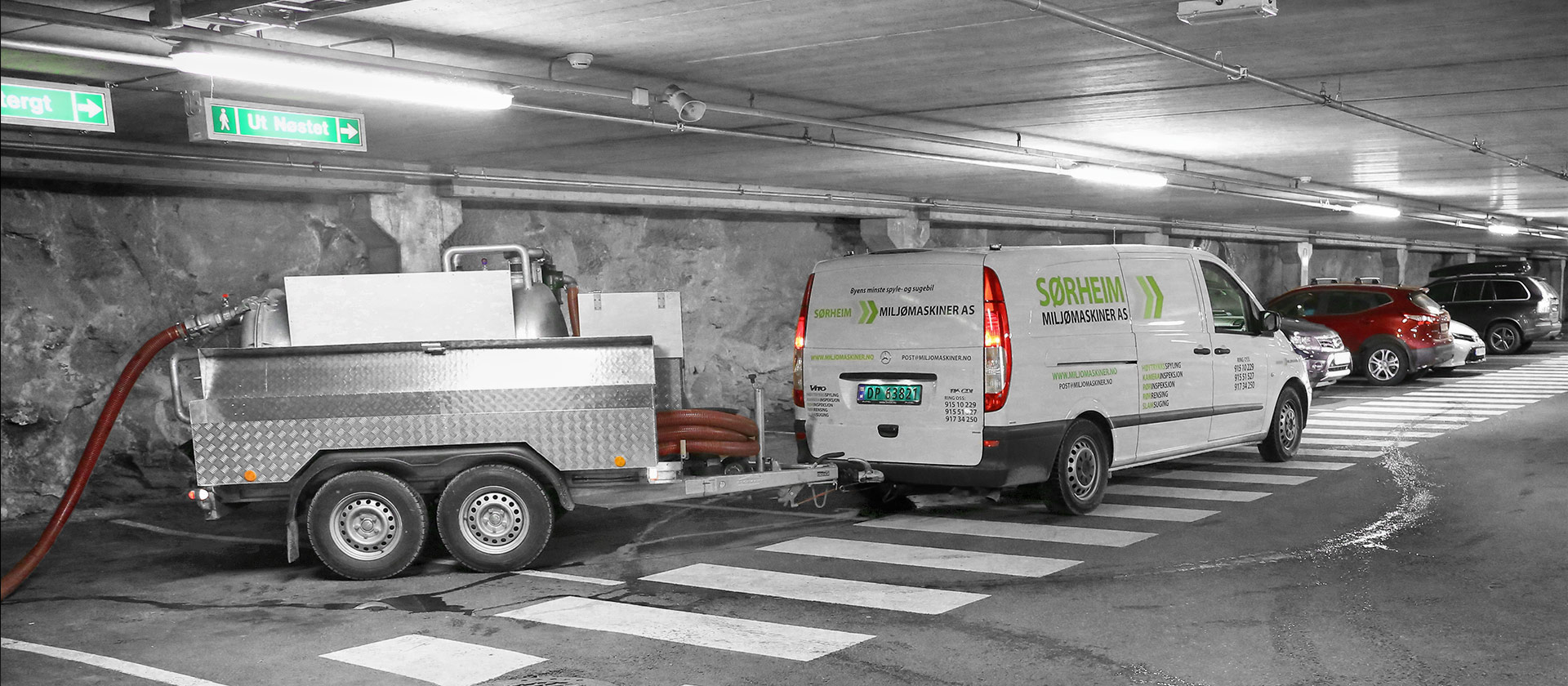 Vi har også en liten spyle bil som gjør at vi også lett kan komme til garasjeanlegg etc. med lav takhøyde. I tillegg til at denne kan spyle med både varmt vann og kaldt vann, har den også en vakuum tilhenger som kan suge opp masse/veske tilsvarende 1000 liter.